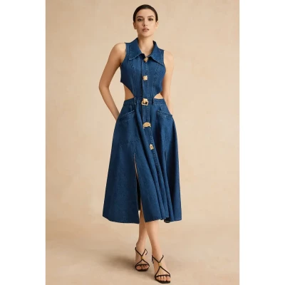 Stylish Sleeveless Denim Dress For Women. It Features An Open - Work Design At The Waist, A Split Hem, And Is Decorated With Metal Buttons.