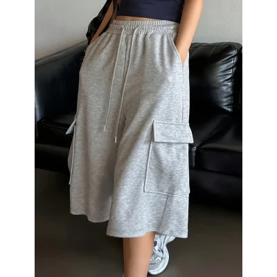 Women's Solid Color Cargo Shorts with Elastic Drawstring Waist, Multiple Pockets & Side Pleats