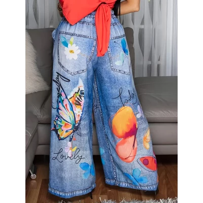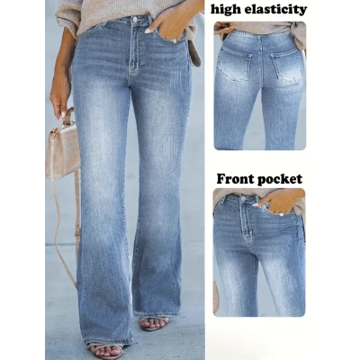 Women's Slim Leg Stretch Flare Jeans with Star Print & Net Splicing - Mid-Stretch Denim, Machine Washable, All-Season Casual Pants (Belt Not Included), Versatile Denim | Medium Elasticity