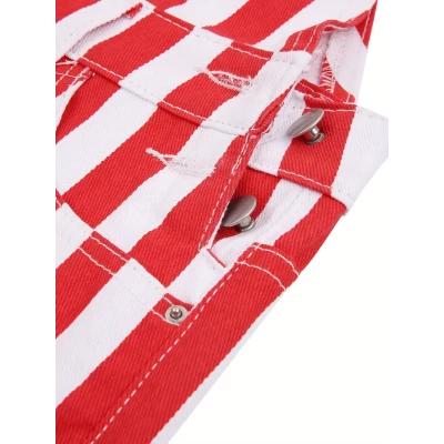 [Color Block Stripe Suspender Shorts] Women Summer Denim Overalls, Adults Color Block Stripe Star Print Suspender Shorts With Pockets