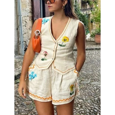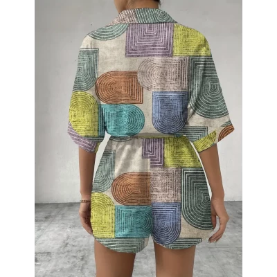 Women's Summer Geometric Print Button-Up Romper with Tie Waist