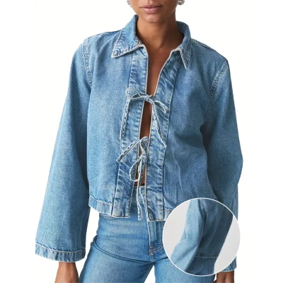 Women'S Denim Tie Front Jacket Lapel Neck Solid Color Long Sleeve Casual Crop Fall Coat