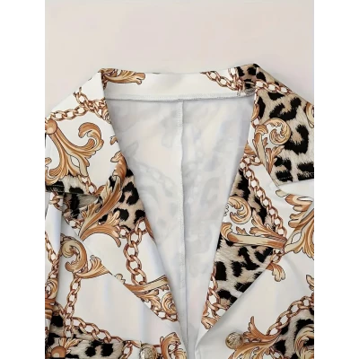 Chain Printed Leopard Print Casual Two-piece Set, Double Breasted Lapel Long Sleeved Suit Jacket And High Waisted Casual Pants, New Autumn Women's Clothing